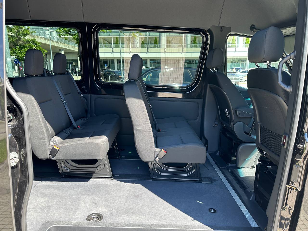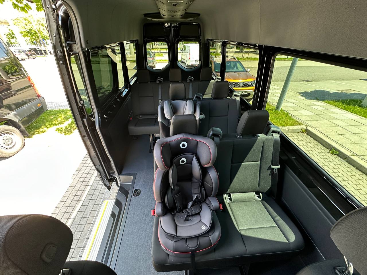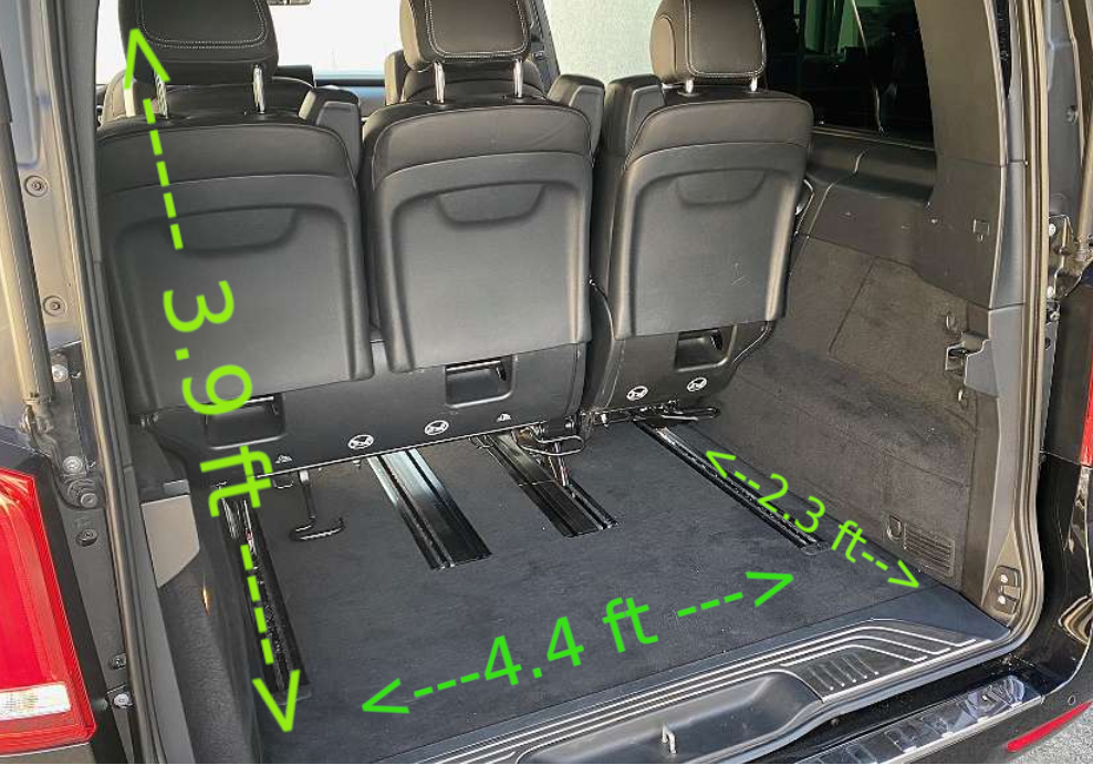 The Sprinter accommodates 9 passengers (compared to the V-Class’s 8) and is considerably larger, measuring approximately 20 feet in length. It features a spacious 5×5 feet luggage area behind the last bench and offers substantially more cargo space—up to 191 cubic feet versus the V-Class’s maximum of 50 cubic feet (with dimensions of 2.5 x 4.5 feet). Tip: We only have the 8-seater V-Class XL, but the shorter V-Klasse looks almost the same but has no cargo space.