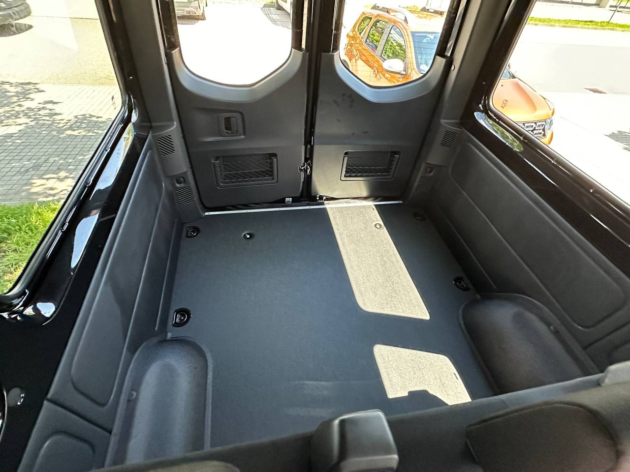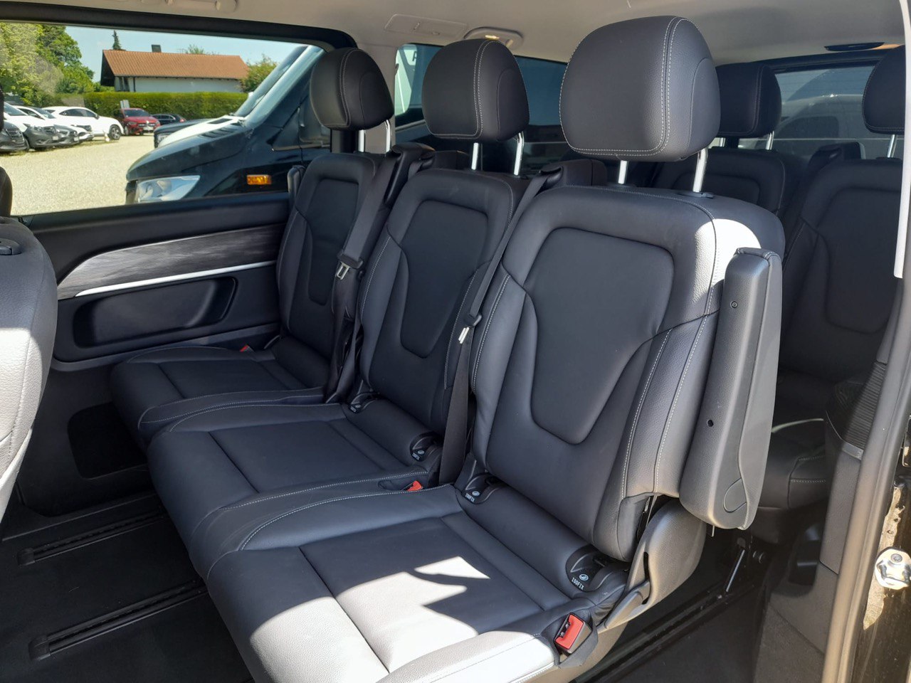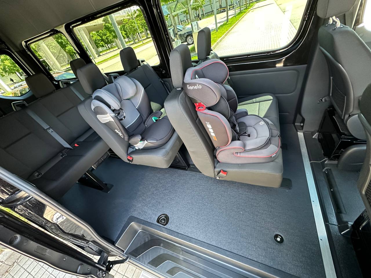 The Sprinter accommodates 9 passengers (compared to the V-Class’s 8) and is considerably larger, measuring approximately 20 feet in length. It features a spacious 5×5 feet luggage area behind the last bench and offers substantially more cargo space—up to 191 cubic feet versus the V-Class’s maximum of 50 cubic feet (with dimensions of 2.5 x 4.5 feet). Tip: We only have the 8-seater V-Class XL, but the shorter V-Klasse looks almost the same but has no cargo space.